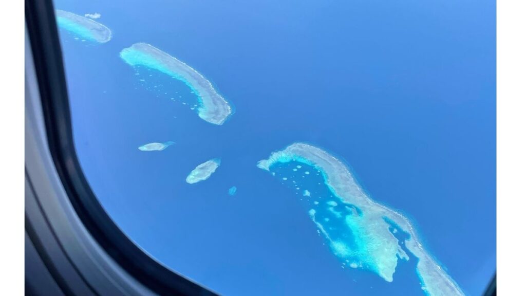 天気のいい日は、飛行機の窓から綺麗なグレートバリアリーフを見ることができます!