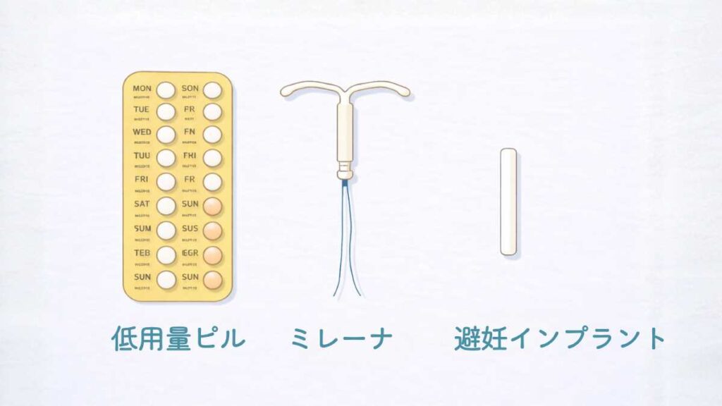 「低用量ピル」や子宮に入れるタイプの「ミレーナ」と「避妊インプラント」の違いを大まかに比較してみます。